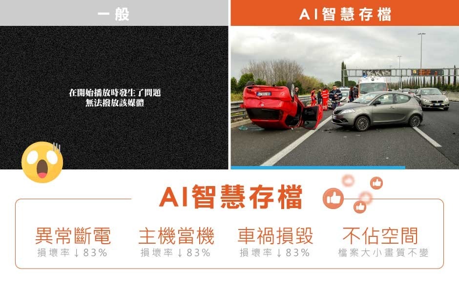 UR1 搭載最新AI智慧存檔技術,大幅度降低所有因外力、斷電造成記憶卡存取不良問題,且檔案大小畫質不變,不占記憶卡空間,遇到任何狀況都完整保留影片!