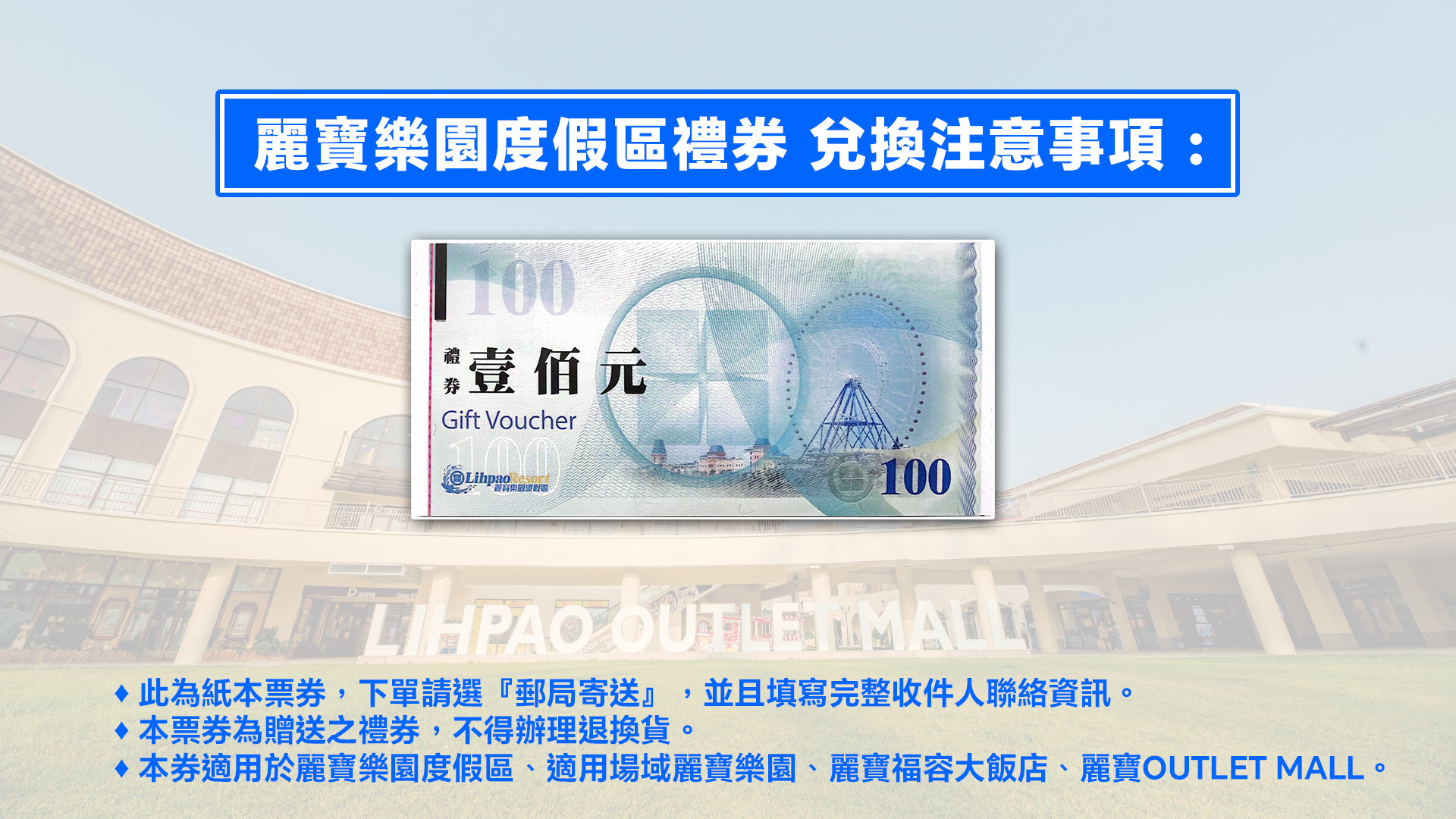 麗寶樂園度假區300元禮券(實體寄送),下單需輸入收件人完整資訊。